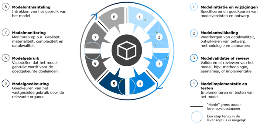 De afbeelding visualiseert de acht stappen. Stap één: Modelinitiatie en wijzigingen, oftewel het specificeren en goedkeuren van modelvereisten en ontwerp. Stap twee: modelontwikkeling, dus het waarborgen van datakwaliteit, ontwikkelen van ontwerp en opstellen van methodologie en aannames. Stap drie: het valideren of reviewen van het model, bijvoorbeeld op methodologie, aannames of implementatie. Stap vier: het implementeren en testen van het model. Stap vijf: het goedkeuren van het vastgestelde gebruik van het model door de relevante organen. Stap zes: vaststellen dat het model wordt gebruikt voor de goedgekeurde doeleinden. Stap zeven: monitoren op onder andere kwaliteit, materialiteit, complexiteit en datakwaliteit. En tot slot stap acht: intrekken van het gebruik van het model wanneer dit nodig en/of wenselijk is.